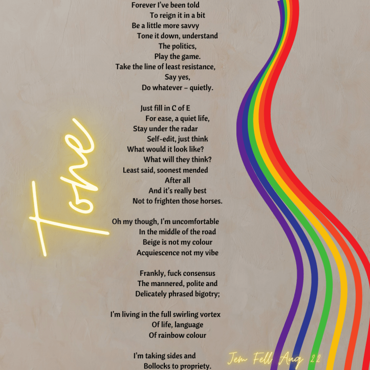 For my whole life there’s been this narrative thrown my way that I should be fitting in more, be more accepting of bending and conforming, something I’m not particularly good at frankly. Way back in the 80s there was an adaptation of A Very British Coup on Channel 4, in it the socialist Prime Minister Harry Perkins says, “I tried middle of road once, got knocked down from both directions.” At 17 that seemed apposite, it still does.